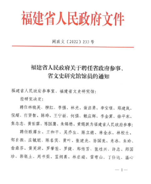 近日,福建省人民政府發布《福建省人民政府關于聘任省政府參事、省文史研究館館員的通知》,協會常務理事蔣欽全(國家級非遺傳承人,福建省泉州市古建筑有限公司董事長)被聘…
