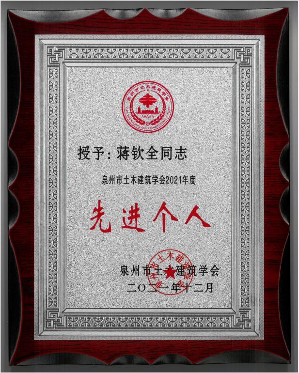 董事長蔣欽全榮獲泉州市土木建筑學會2021年度先進個人