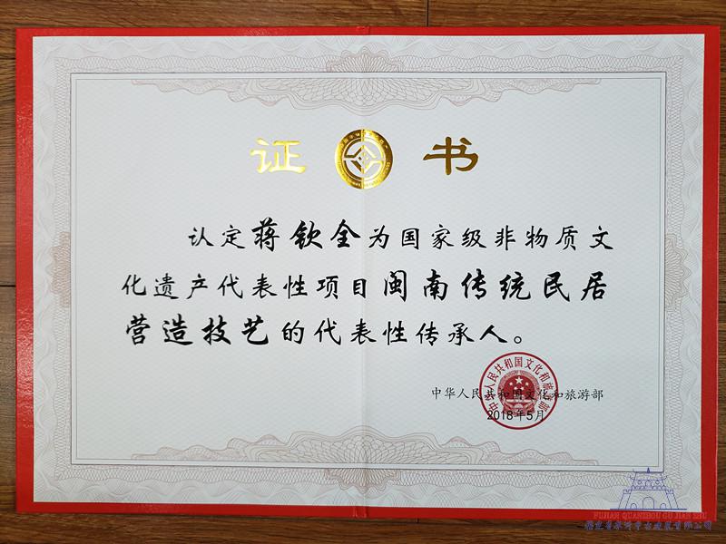 6月9日,由省文化廳主辦的“文化和自然遺產日”福建系列活動啟動儀式在福建博物院舉行,董事長蔣欽全獲頒第五批國家級非遺傳承人證書。