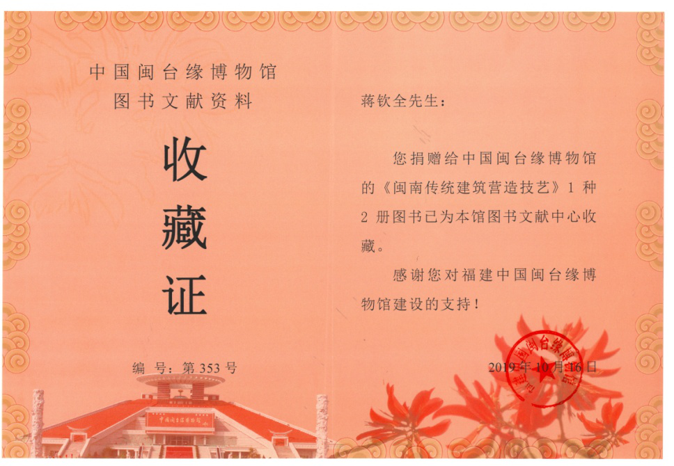 開幕儀式上,國家級閩南傳統民居營造技藝傳承人蔣欽全的專著《閩南傳統建筑營造技藝》被中國閩臺緣博物館圖書文獻中心收藏。